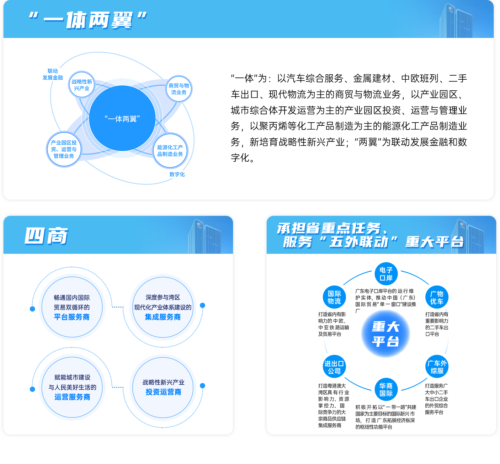 近年来,广物控股集团坚持以习近平新时代中国特色社会主义思想为指导,坚决落实省委、省政府决策部署,围绕建设成为具有国内影响力、服务粤港澳大湾区建设的生产性综合服务商的功能定位,紧扣“一体两翼”战略,聚焦发展“商贸与物流(建材、汽车、中欧班列),产业园区投资、运营与管理,能源化工产品制造(聚丙烯等化工产品)”三大主业,布局进军新材料、新能源装备制造与应用等战略性新兴产业,联动发展“金融和数字化”两翼,已成为“贸工技投”一体化的大型产业集团,高质量发展态势日益凸显。