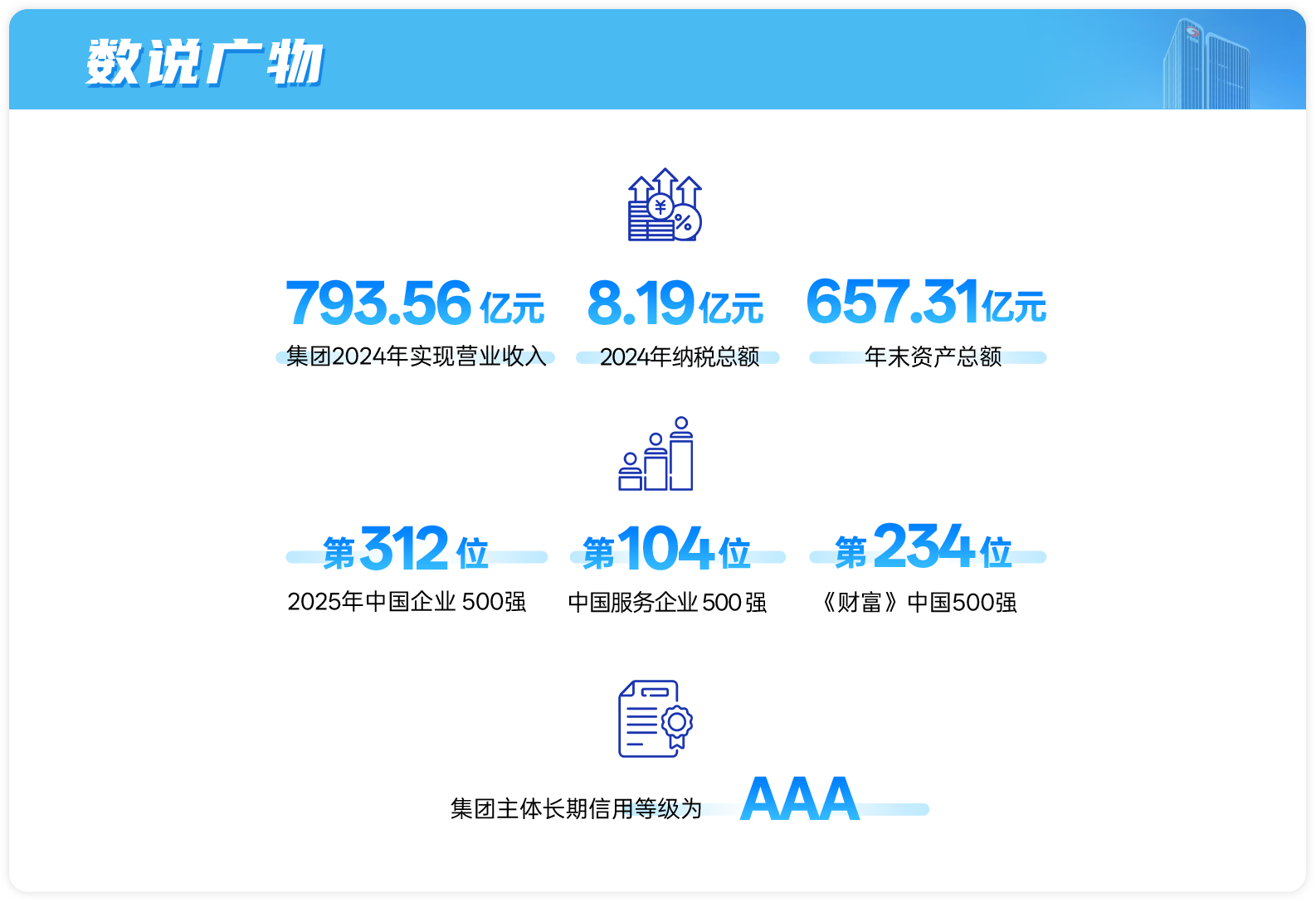 广物控股集团前身是1951年成立的广东省物资局,1983年转制为广东省物资总公司,1994年改组为广东物资集团公司,2015年更名为广东省广物控股集团有限公司,2019 年 6 月根据省委、省政府的决定,与原广东省商贸控股集团有限公司完成合并重组。拥有员工近 1 万人,200 多家子企业,总部内设 11 个职能部门 , 是省属国有独资大型骨干企业集团,国务院国资委国企改革“双百企业”,连续 20 多年入围中国企业 500 强和中国服务业企业 500 强,获颁信用评级“AAA”级企业。
